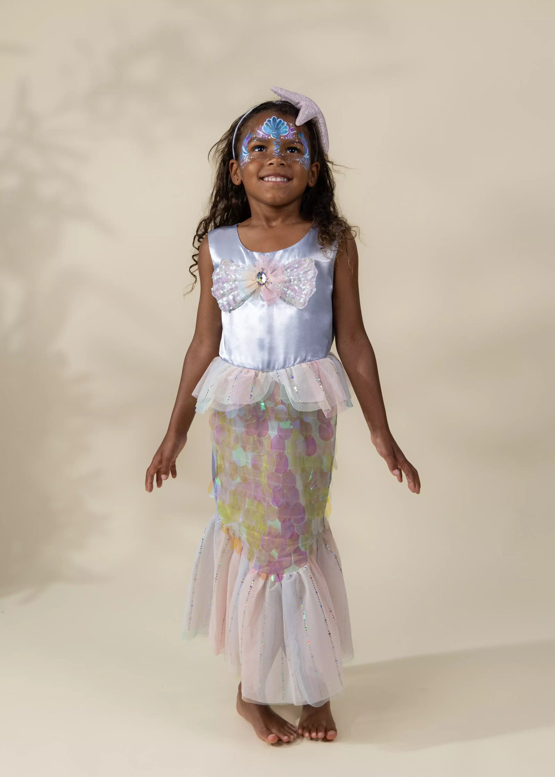 Dive into a world of sparkle with an enchanting Mermaid Costume & Starfish Headband set! This set features a shimmering dress with magical details and a glittery starfish headband to complete the look. Perfect for under-the-sea adventures and dress-up fun. Features 100% polyester excluding trims. Assembly Instructions: Do not bleach. Hand wash only. Do not tumble dry. Do not iron. Do not dry clean. Wring and lay flat to dry.